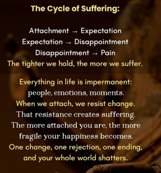 The basis of grief/loss is attachment, attachment and dependence occur because we feel incomplete within ourselves therefore we seek objects, people, relationships, concepts to fulfil inner needs. Attachment causes dependency.